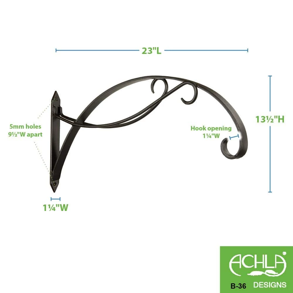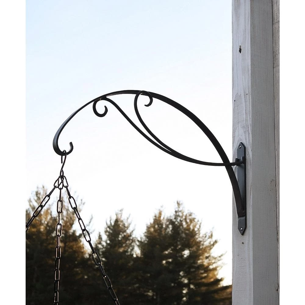 The Scroll Bracket has a gently curling downturned hook with 2 counter-arching scrolls. It is specifically designed to hold large hanging baskets, 24 in. Dia or larger. Measures 24 in. L x 11 in. H and is finished in Black powder-coat.
