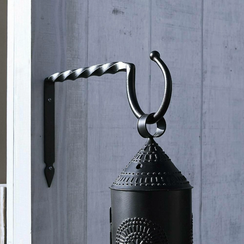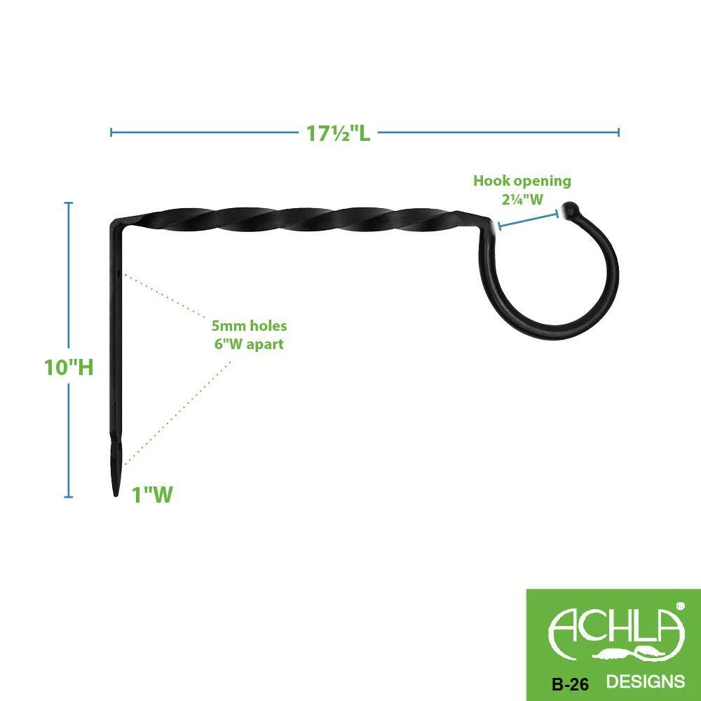Hand-made with a traditional wrought iron technique, the Jumbo Bracket is made from a thick square iron section that is twisted and tapered to form a wide hook with a ball end. The large opening allows for hanging items with wide handles, such as large lanterns or baskets. This colonial-style hook is available in 2 sizes, 14 in. and 18 in. L. Achla Designs makes a wide variety of wrought iron hooks and brackets in all shapes and sizes for hanging your indoor and outdoor items. Employing traditional wrought iron techniques, we have brackets from large and decorative, to simple utilitarian j-hooks and extenders, in both square and round stock, single hooks, or multiple hook brackets. All our hooks and brackets are powder coated in Black or Graphite, to preserve the look of the natural wrought iron, while giving them maximum durability and weather resistance. Makers of fine quality goods for the home and garden since 1994, we offer a full line of Achla Designs wrought iron landscape structures, plant supports and stands, birdbaths and other decorative garden elements.