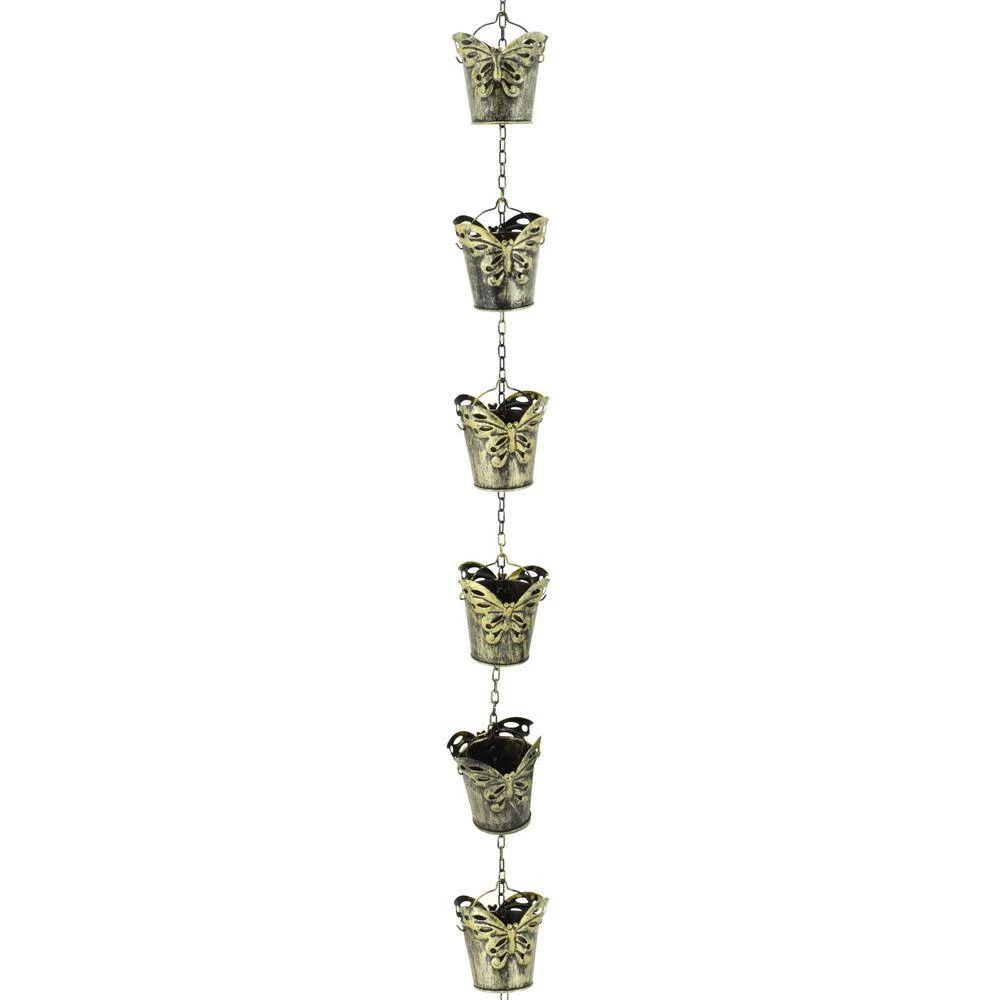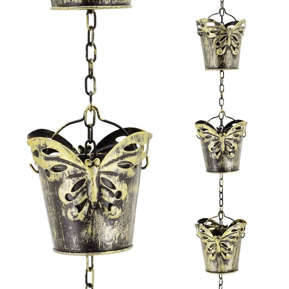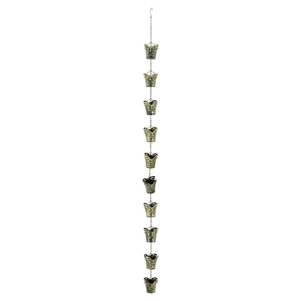 Enjoy the rain and sounds of falling water with this whimsical Rain Chain. It includes 10 butterfly pails which flow down from one pail to another while collecting the water in a rain barrel if desired. It is designed for easy hanging as a vertical water feature or downspout with a hook at the top of the chain. It is artfully designed with a rustic powder coated paint and glazed topcoat.