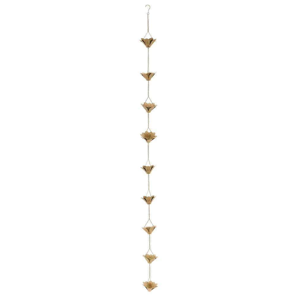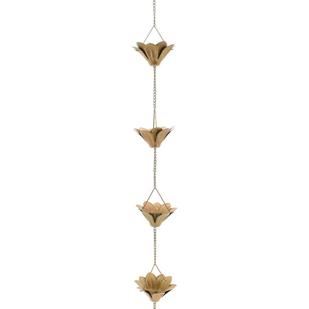Enjoy the rain and sounds of falling water with this captivating Rain Chain. It includes 9 open blossom flowers which flow down from one to another while collecting the water in a rain barrel if desired. It is designed for easy hanging as a vertical water feature or downspout with a gutter clip at the top of the chain. It is artfully designed with a powder coated shiny gold colored glazed topcoat.