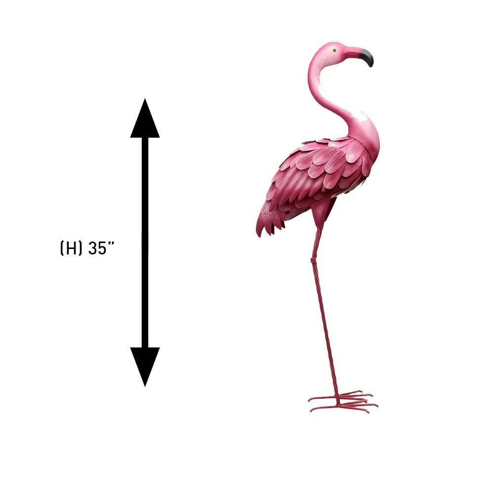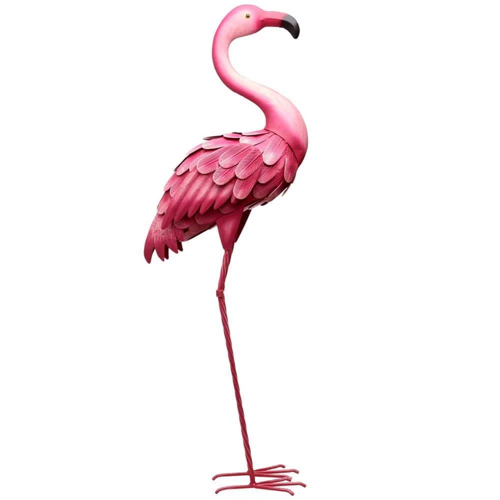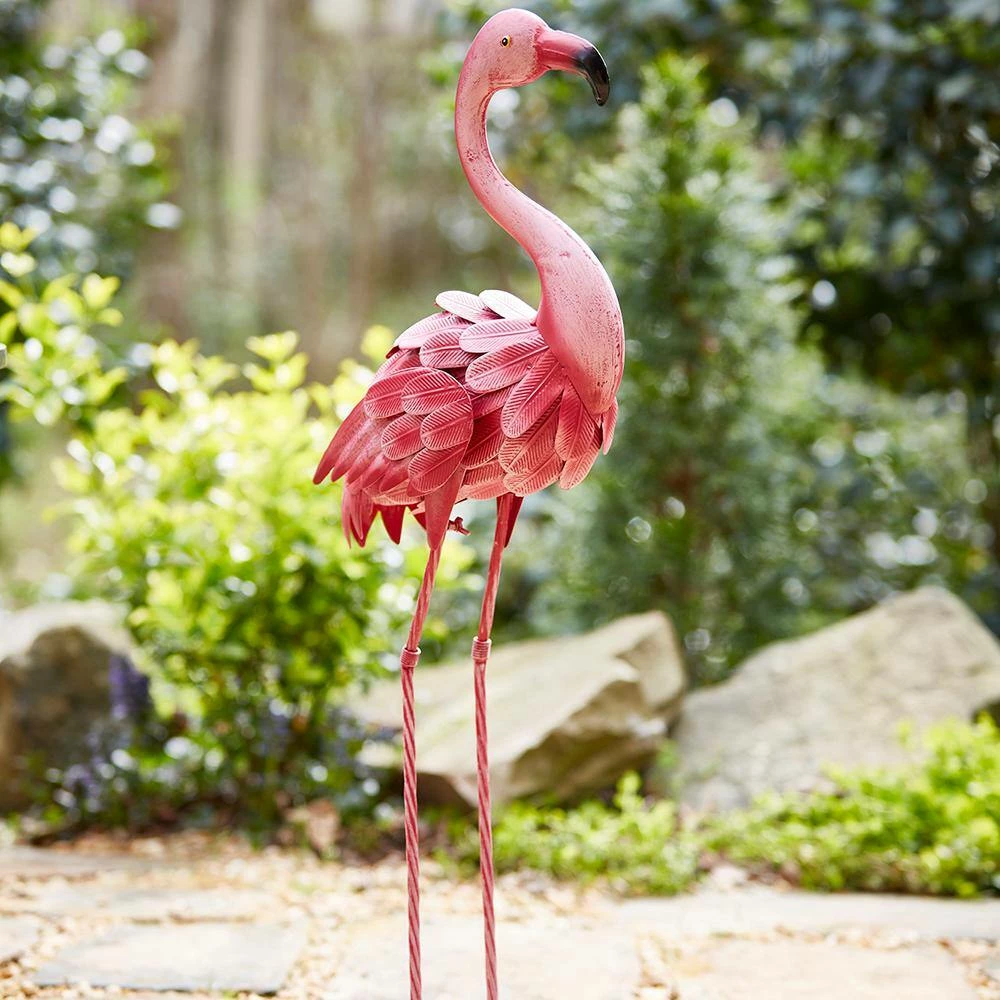 - Fun and quirky flamingo-inspired lawn decor crafted from metal
