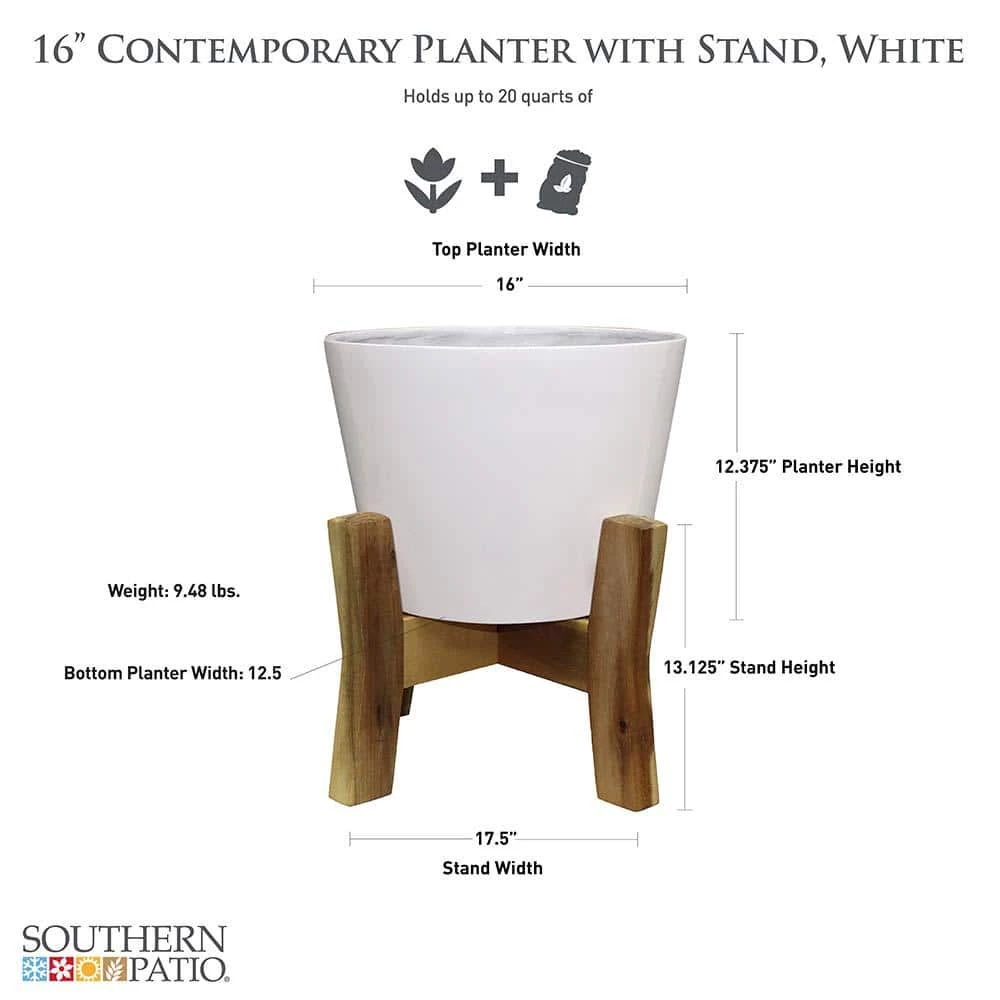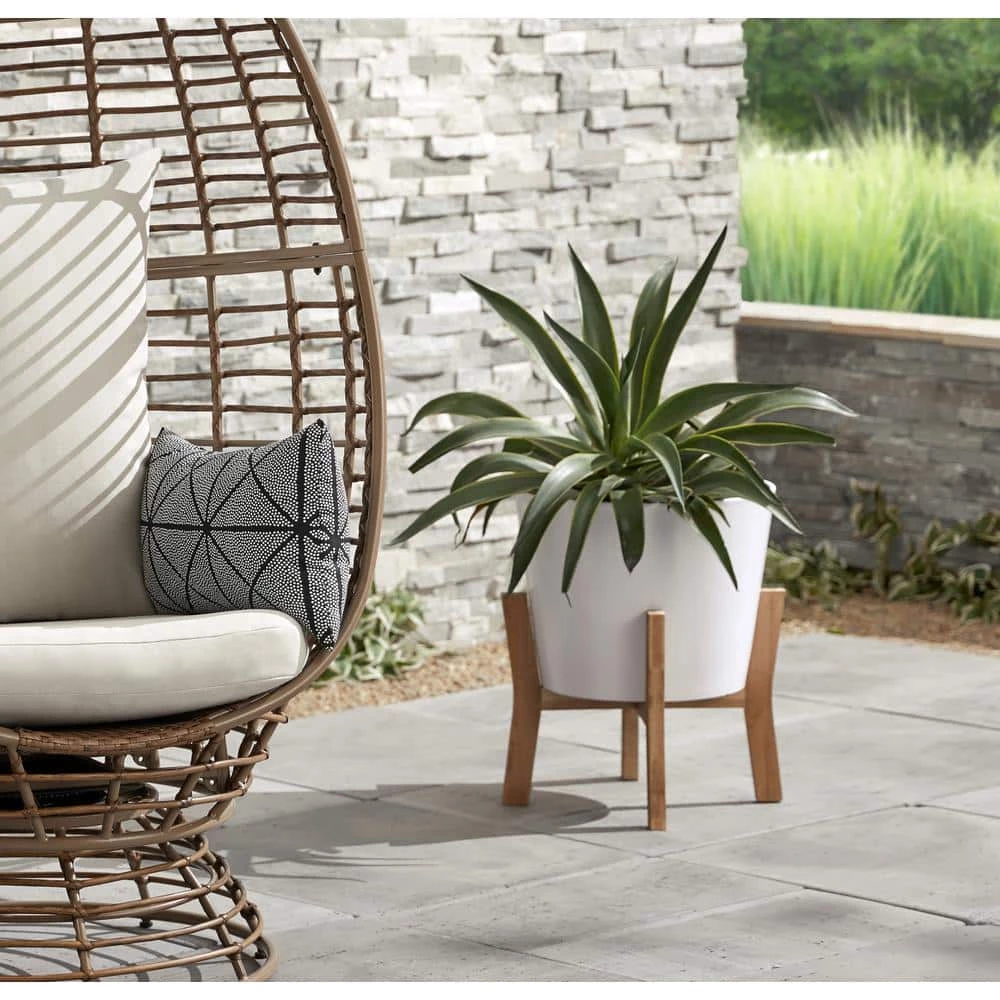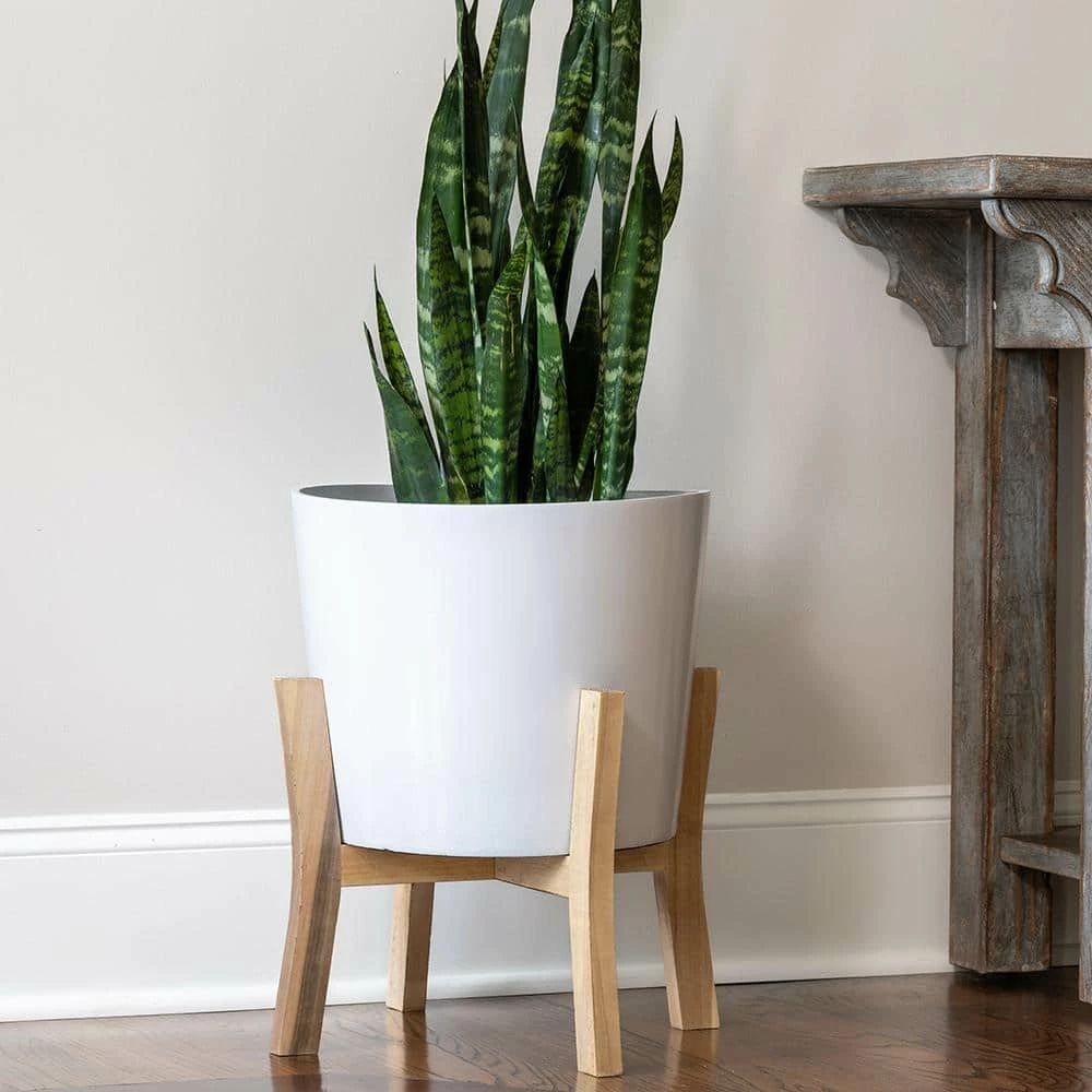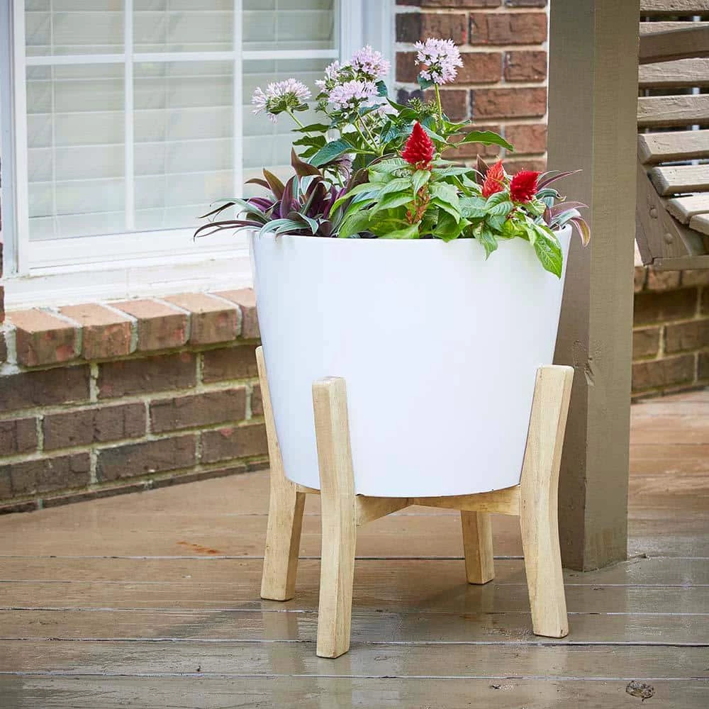 - Wooden stand adds decorative element to planter