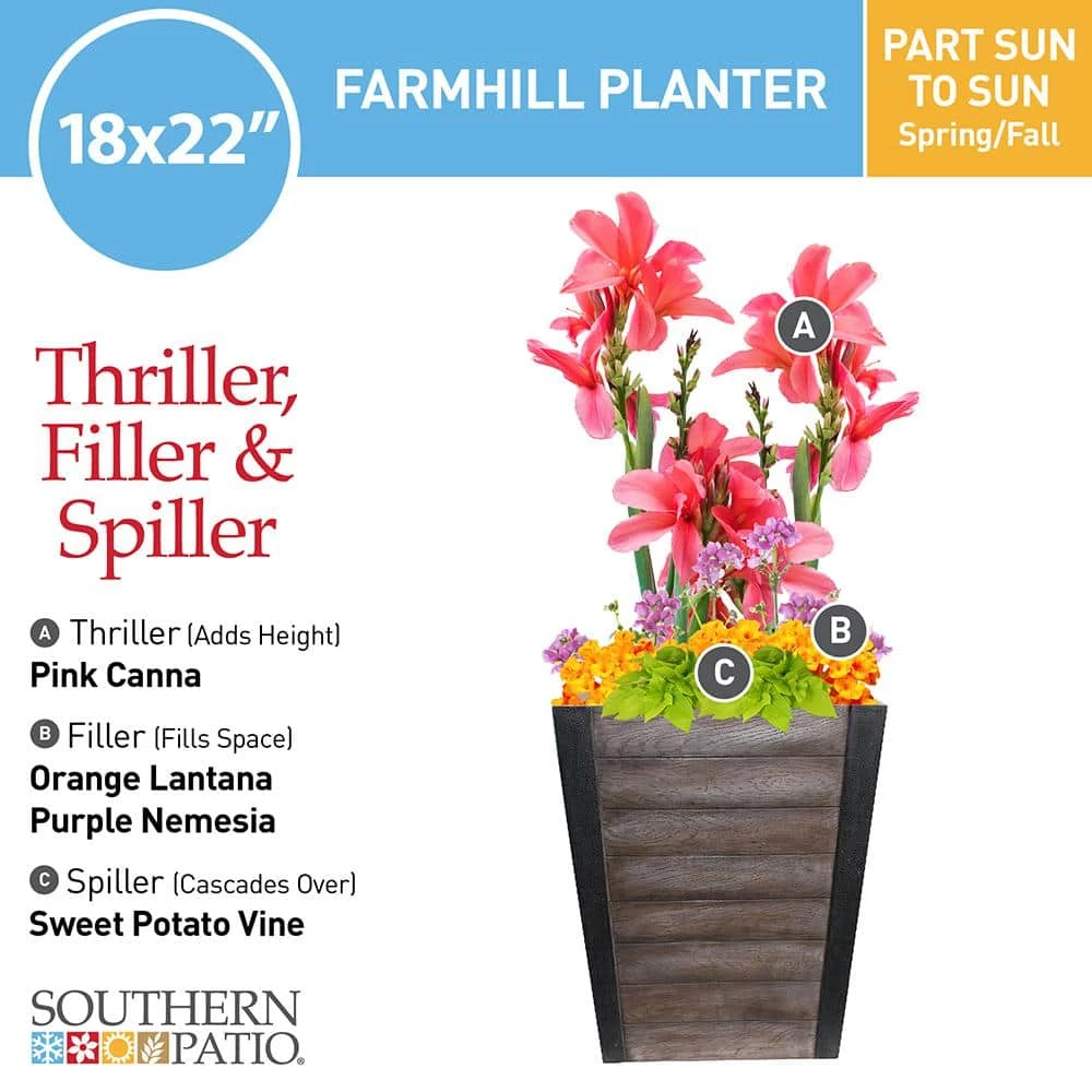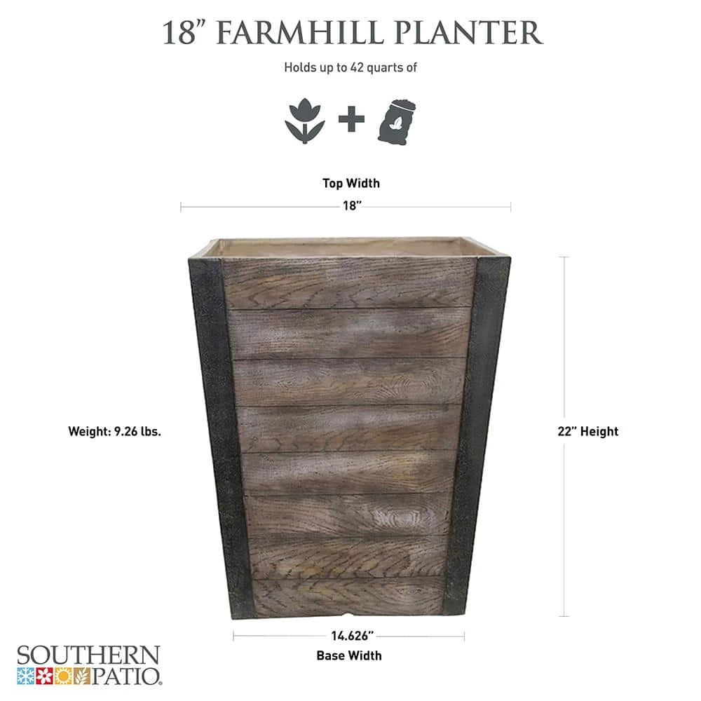 Accent your outdoor space with the resin Farmhill planter by Southern Patio. A lightweight and durable alternative to heavy ceramic planters, it features a drainage hole with a plug to protect your plants from overwatering. This tall outdoor planter can support greenery ranging from tall trees to smaller shrubbery.