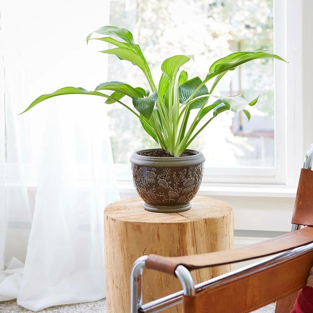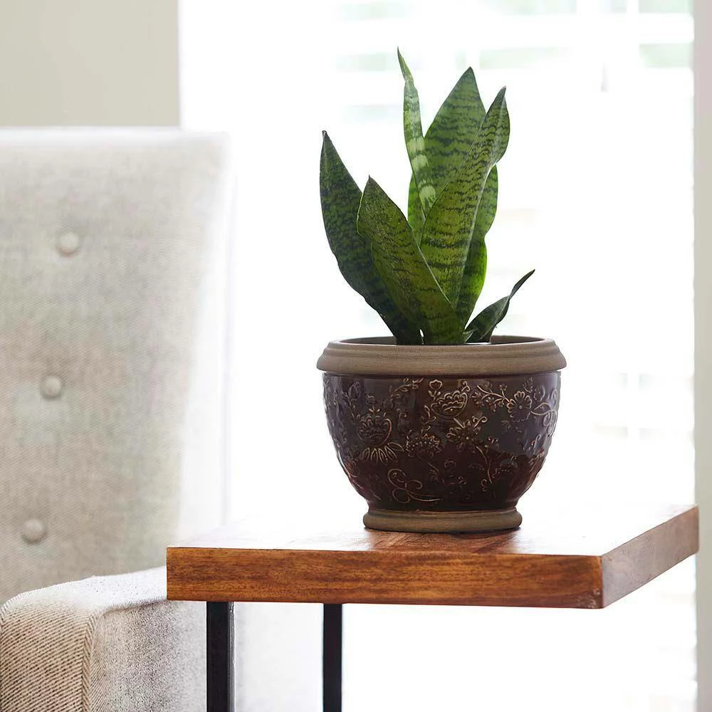 - Brown glazed pot with deep gray rim and flower-patterned finish