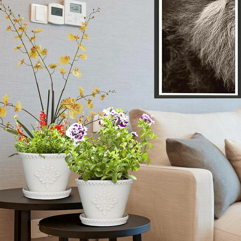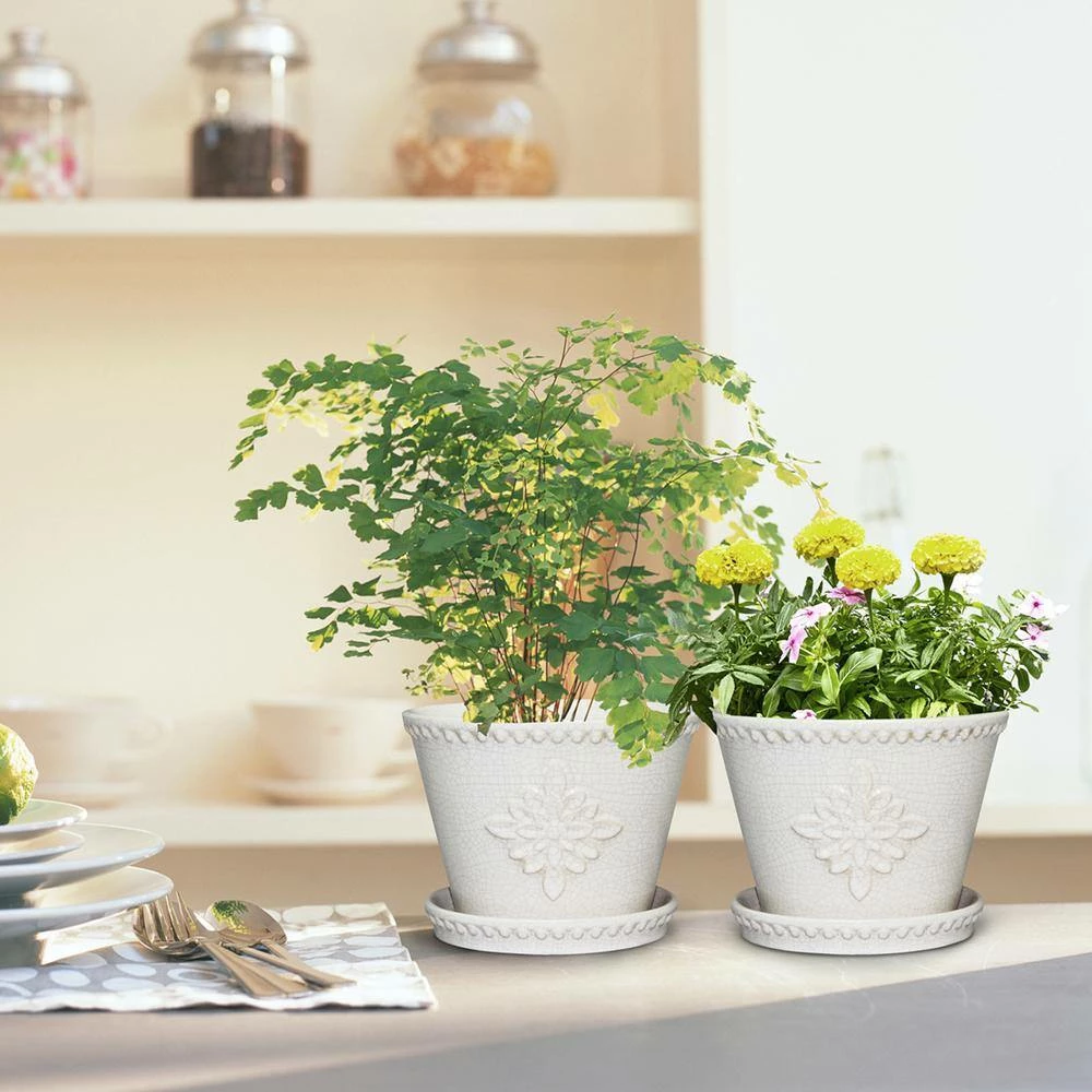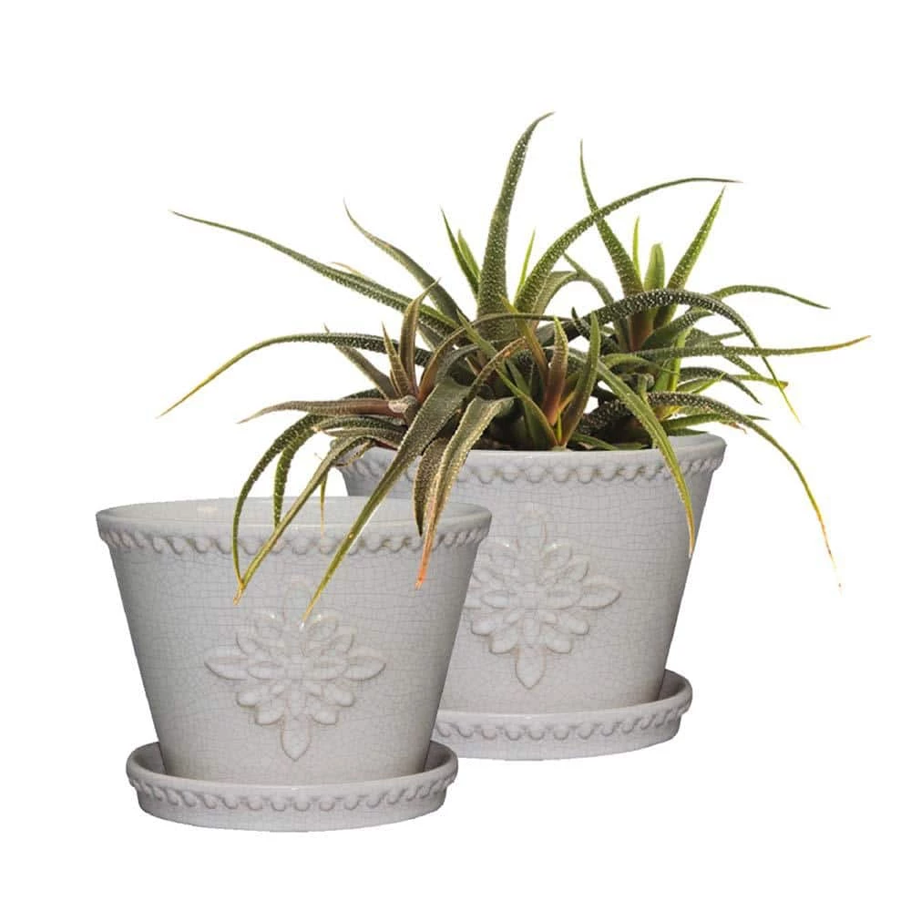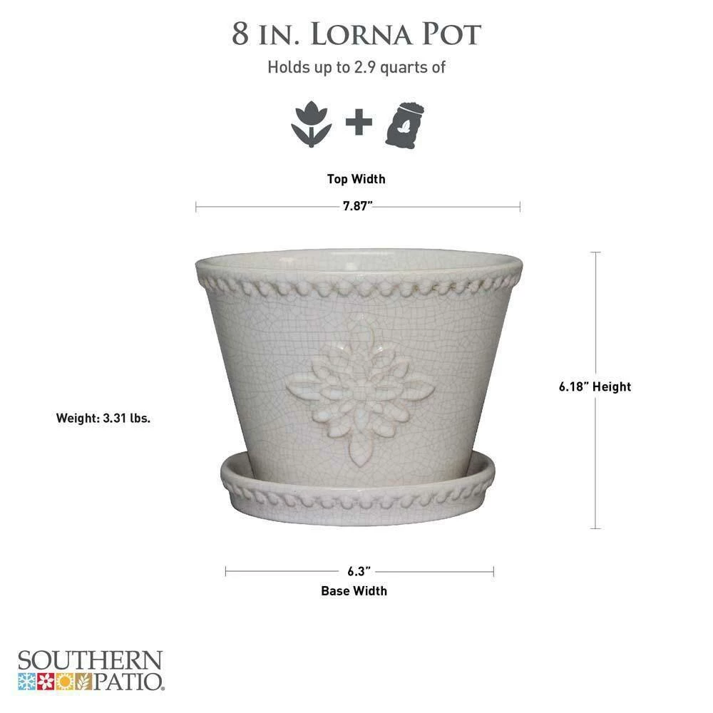 Southern Patios white Lorna planter is dainty, both aesthetically and proportionally. Two embossed flowers are featured on these crackle glazed pots and an impression of lace is added to its mouth and attached saucer. Southern Patios authentic ceramic planters are heavy duty and one of a kind.
