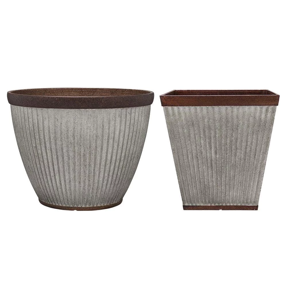 Give your favorite succulents or perennials a happy home with the Southern Patio Planter with Square Rustic Box Flower Pot. This bundle comes with an outdoor planter urn with a square rustic box flower pot. This large planter pot is perfect for medium and large blossoms, providing ample room for up to 40 quarts of loosely-packed potting soil. Crafted from durable resin, the indoor planter pot has the look of a charming old-fashioned planter but is lighter and more durable for everyday use. The bowed body features fluted, corrugated lines with a galvanized finish that mimics the look of the tin without worrying about rust. A brown finish accents the rim and base for a weathered, faux-oxidized look. The square rustic box is crafted from durable resin, the indoor planter pot has the look of a charming antique planter but is lighter and more durable for everyday use. Ensure to add a bit of elegance with the Southern Patio Rustic Urn with Box Flower Pot.