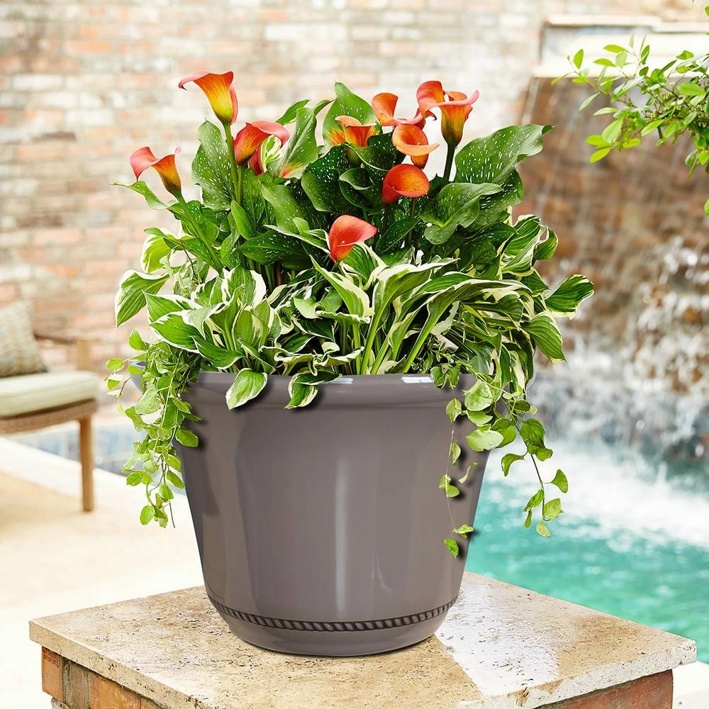 Practical and pleasing to the eye, these glossy planters contribute a modern look to your floral presentations with attractive shape and bold color. The Westbourne Flange planter is especially unique with its ridged lip and curvature. Whether indoors or outdoors, these high density resin planters fare well against harsh UV rays and are resistant to cracking.