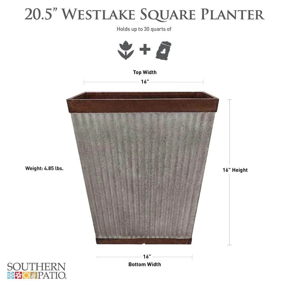 Weathered and rusted, the Westlake Square Planter adds an old-fashioned feel to any outdoor living area. The grooved pattern introduces texture, while the galvanized finish emphasizes the decorative planters time-honored traits. Lightweight and durable, this resin garden pot is resistant to the elements, protected against fading and sure to provide a safe environment for any shrubbery to flourish.